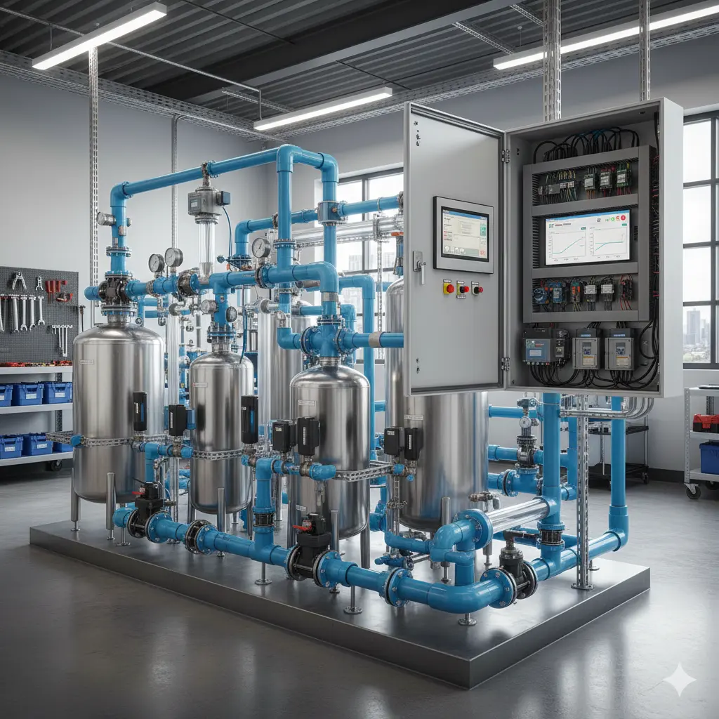 Inclui filtros, elementos de retenção e sistemas de dosagem para correção de pH, condutividade e parâmetros essenciais da água.